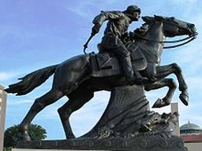 Part-way in the steep climb Sam was to get a fresh mustang. Before he reached the relay man, his mustang slipped and could not get up. As Sam jumped from the saddle, he fell hard onto the ground and ripped his cheek against a large rock. Immediately he stood, snatched the mail bag, and blew his horn to alert the relay man. It was now light enough to see the trail. The relay man heard the blasts and hurried with a fresh mustang to meet Sam.